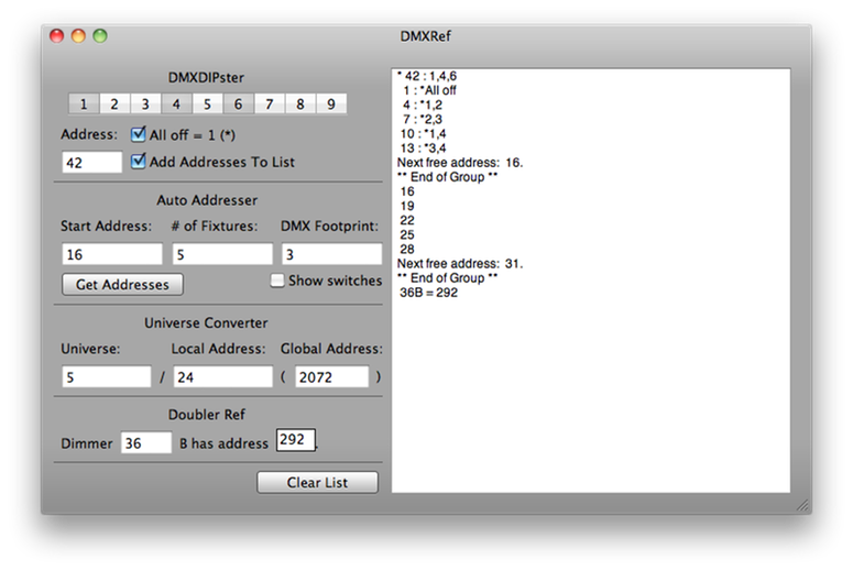 DMXRef is designed to take the math out of working with DMX. DMXRef includes DIP switch and auto addressing functions, conversion between local and global addresses, and Dimmer Doubler decoding.